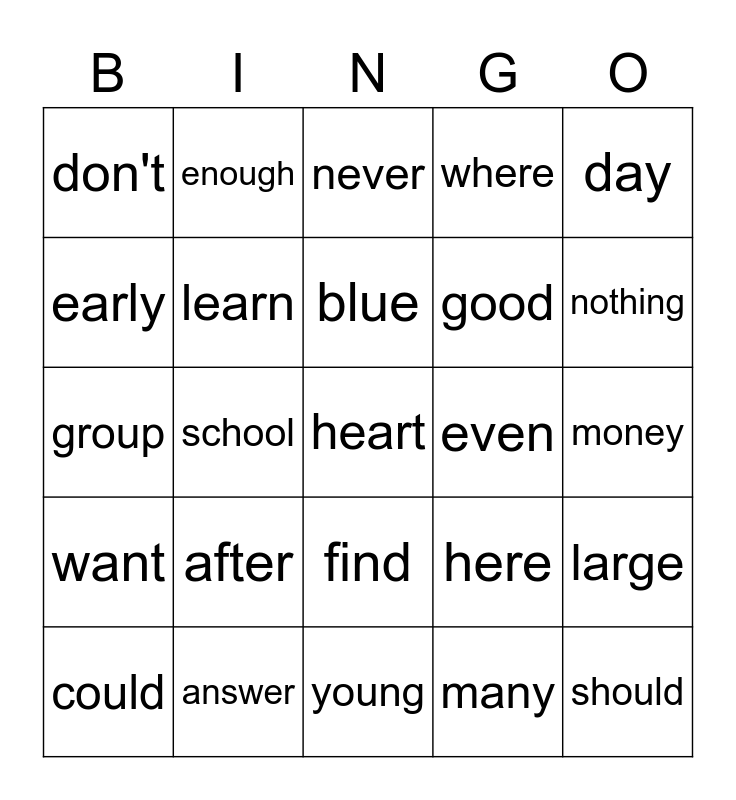 This bingo card has a free space and 24 words: after, answer, blue, could, day, don't, early, enough, even, find, good, group, here, large, learn, many, money, never, nothing, school, should, want, where and young.