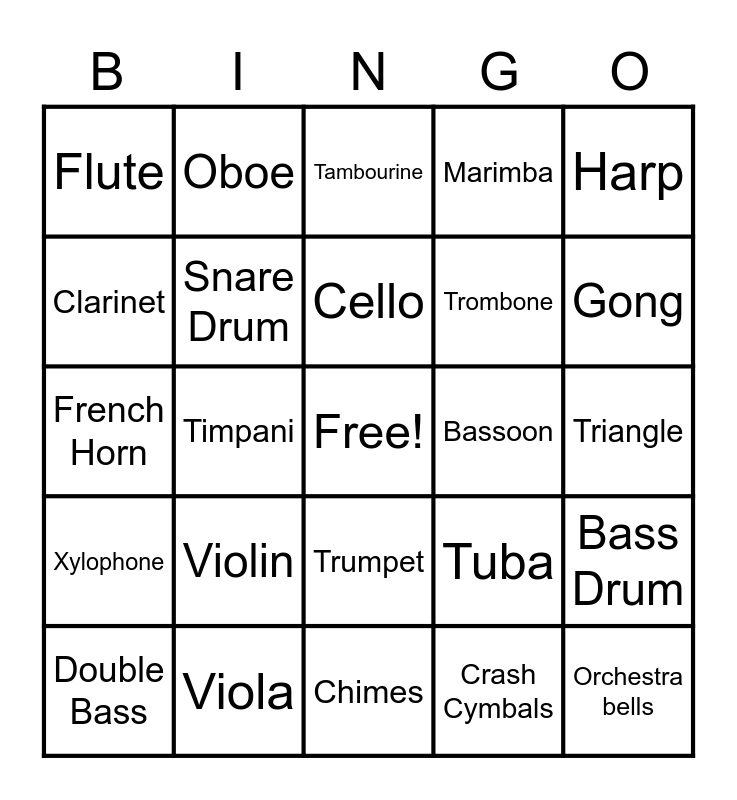 This bingo card has a free space and 24 words: Violin, Viola, Cello, Double Bass, Harp, Flute, Clarinet, Oboe, Bassoon, Trumpet, Trombone, French Horn, Tuba, Bass Drum, Snare Drum, Crash Cymbals, Triangle, Tambourine, Gong, Timpani, Orchestra bells, Xylophone, Marimba and Chimes.