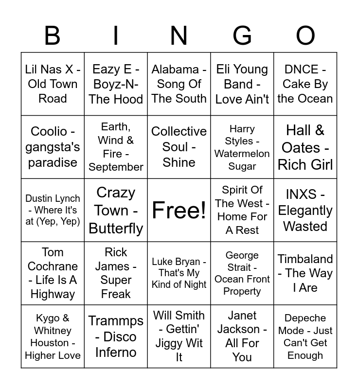This bingo card has a free space and 75 words: 54-40 - Ocean Pearl, Afroman - Because I Got High, Alabama - Song Of The South, Arrested Development - People Everyday, Baltimora - Tarzan Boy, Bruno Mars - 24K Magic, Carly Rae Jepson - Call Me Maybe, Chamillionaire - Ridin Dirty, Chris Janson - Buy Me A Boat, Christina Aguilera - Dirrty, Chromeo - Jealous (I Ain't With It), Clarence Carter - Strokin', Collective Soul - Shine, Coolio - gangsta's paradise, Corb Lund - The Truck Got Stuck, Crazy Town - Butterfly, David Lee Murphy - Dust On The Bottle, Depeche Mode - Just Can't Get Enough, Dexy's Midnight Runners - Come On Eileen, DNCE - Cake By the Ocean, Duncan Shiek - Barely Breathing, Dustin Lynch - Where It's at (Yep, Yep), Earth, Wind & Fire - September, Eazy E - Boyz-N-The Hood, Eli Young Band - Love Ain't, Elvis Presley - Heartbreak Hotel, Eric Clapton - I Shot The Sheriff, Fall Out Boy - Beat It ft. John Mayer, Fifth Harmony - Work from Home, Fine Young Cannibals - She Drives Me Crazy, Fitz and the Tantrums - HandClap, Fleetwood Mac - Little Lies, Garth Brooks - Two of a Kind, Workin' on a Full House, George Strait - Ocean Front Property, Hall & Oates - Rich Girl, Harry Styles - Watermelon Sugar, Hozier - Take Me To Church, Iggy Azalea - Fancy (Feat. Charli XCX), INXS - Elegantly Wasted, Janet Jackson - All For You, Jay Z - Izzo, Jess Moskaluke - Cheap Wine and Cigarettes, John Cougar Mellencamp - Hurt So Good, Jonas Brothers - Sucker, Ke$ha - TiK ToK, Kool & The Gang - Ladies Night, Kygo & Whitney Houston - Higher Love, Lil Nas X - Old Town Road, Lisa Loeb - Stay, LoCash - I Know Somebody, Lou Bega - Mambo #5, Luke Bryan - That's My Kind of Night, Macklemore - Downtown, Mark Morrison - Return Of The Mack, Maxi Priest (Ft. Shaggy) - That Girl, My Chemical Romance - Welcome To The Black Parade, Old Dominion - Written in the Sand, Papa Roach - Last Resort, R. Kelly - Ignition, Rancid - Fall Back Down, Rick James - Super Freak, Rick Springfield - Jessie's Girl, Roxette - It Must Have Been Love, Scorpions - No one like you, Scorpions - Rock You Like A Hurricane, Spirit Of The West - Home For A Rest, The Contours - Do You Love Me, The Mavericks All You Ever Do Is Bring Me Down, Tim McGraw - Real Good Man, Timbaland - The Way I Are, Tom Cochrane - Life Is A Highway, Trammps - Disco Inferno, Trick Pony - Pour Me, Will Smith - Gettin' Jiggy Wit It and 24kgoldn - Mood (feat. iann dior).