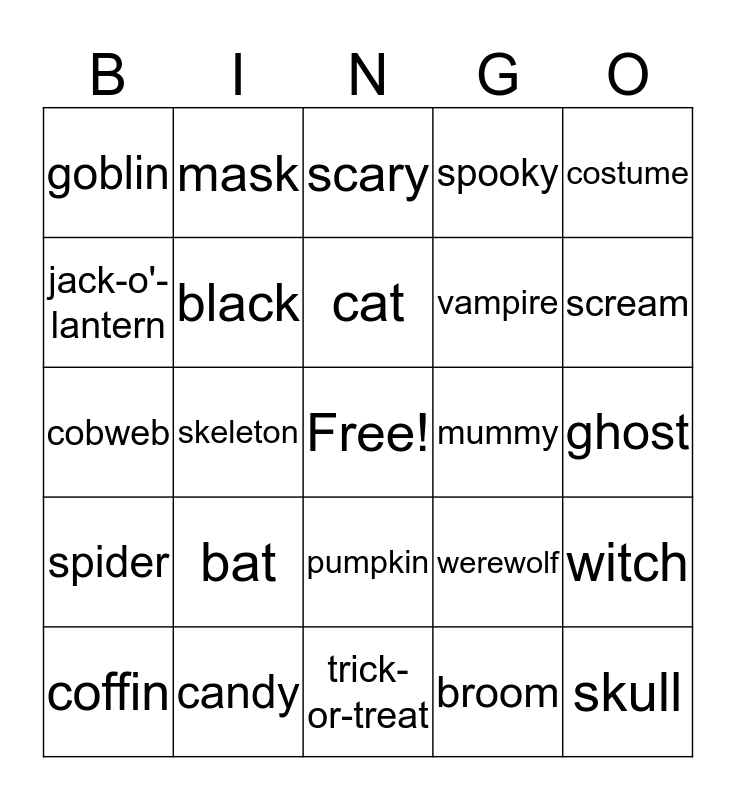 This bingo card has a free space and 24 words: bat, candy, cat, coffin, costume, goblin, jack-o'-lantern, mask, mummy, pumpkin, vampire, cobweb, werewolf, witch, black, broom, ghost, scary, scream, skeleton, skull, spider, spooky and trick-or-treat.