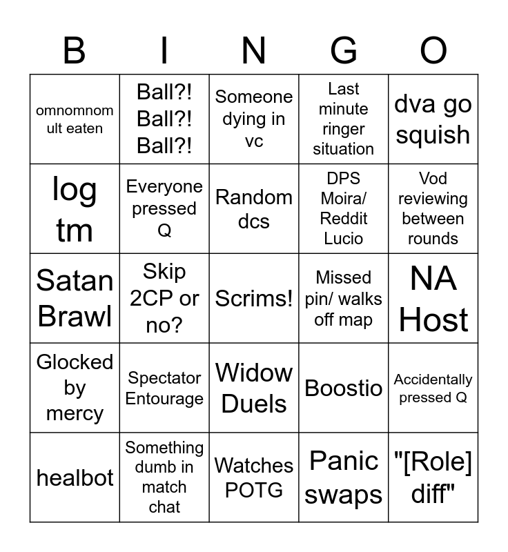 This bingo card has a free space and 24 words: Spectator Entourage, Something dumb in match chat, Random dcs, healbot, dva go squish, omnomnom ult eaten, log tm, Ball?! Ball?! Ball?!, Missed pin/ walks off map, Widow Duels, DPS Moira/ Reddit Lucio, Satan Brawl, Boostio, Accidentally pressed Q, Everyone pressed Q, Panic swaps, NA Host, Someone dying in vc, Vod reviewing between rounds, Skip 2CP or no?, "[Role] diff", Glocked by mercy, Last minute ringer situation and Watches POTG.