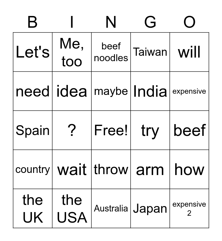 This bingo card has a free space and 24 words: wait, the USA, maybe, the UK, will, Let's, need, Me, too, try, throw, India, Spain, arm, how, idea, Japan, beef, beef noodles, expensive, ?, expensive 2, country, Taiwan and Australia.
