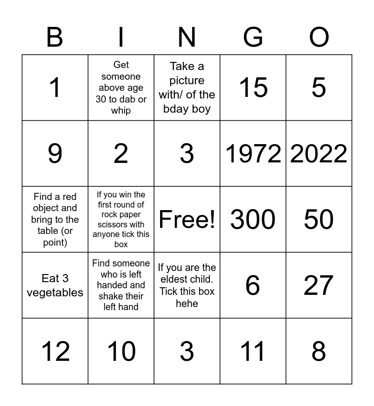This bingo card has a free space and 24 words: Find someone who is left handed and shake their left hand, 10, 3, 12, 5, 1, 9, Get someone above age 30 to dab or whip, 300, If you are the eldest child. Tick this box hehe, 1972, Find a red object and bring to the table (or point), 6, 27, 2, 11, 50, Take a picture with/ of the bday boy, 2022, If you win the first round of rock paper scissors with anyone tick this box, 8, Eat 3 vegetables, 15 and 3.