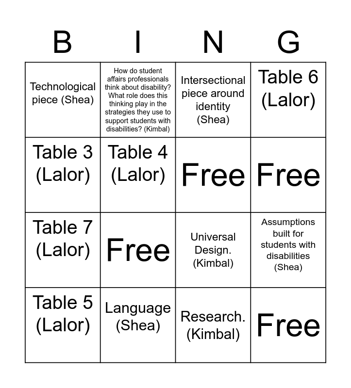 This bingo card has 16 words: Language (Shea), Assumptions built for students with disabilities (Shea), Intersectional piece around identity (Shea), Technological piece (Shea), Table 7 (Lalor), How do student affairs professionals think about disability? What role does this thinking play in the strategies they use to support students with disabilities? (Kimbal), Universal Design. (Kimbal), Research. (Kimbal), Table 3 (Lalor), Table 4 (Lalor), Table 5 (Lalor), Table 6 (Lalor), Free, Free, Free and Free.