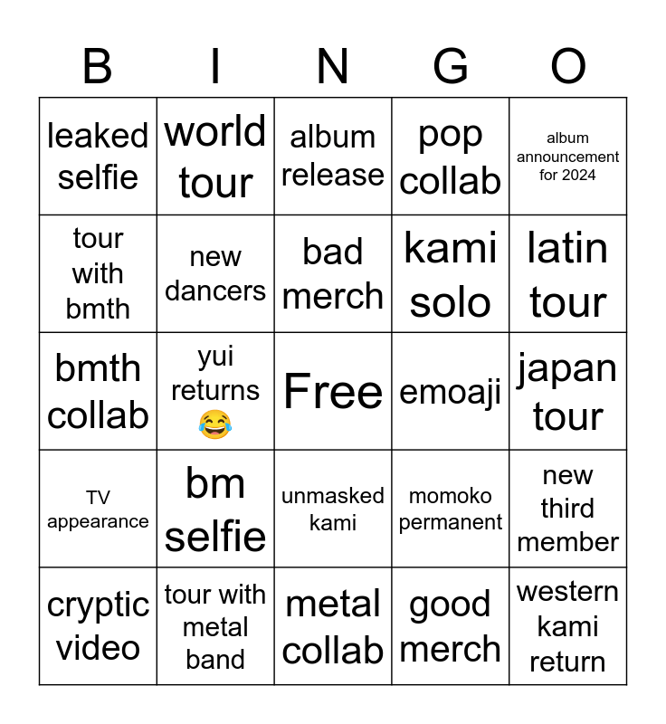 This bingo card has a free space and 24 words: cryptic video, bm selfie, bad merch, good merch, album announcement for 2024, leaked selfie, world tour, album release, emoaji, japan tour, bmth collab, new dancers, momoko permanent, new third member, tour with bmth, tour with metal band, metal collab, pop collab, latin tour, TV appearance, yui returns 😂, unmasked kami, kami solo and western kami return.