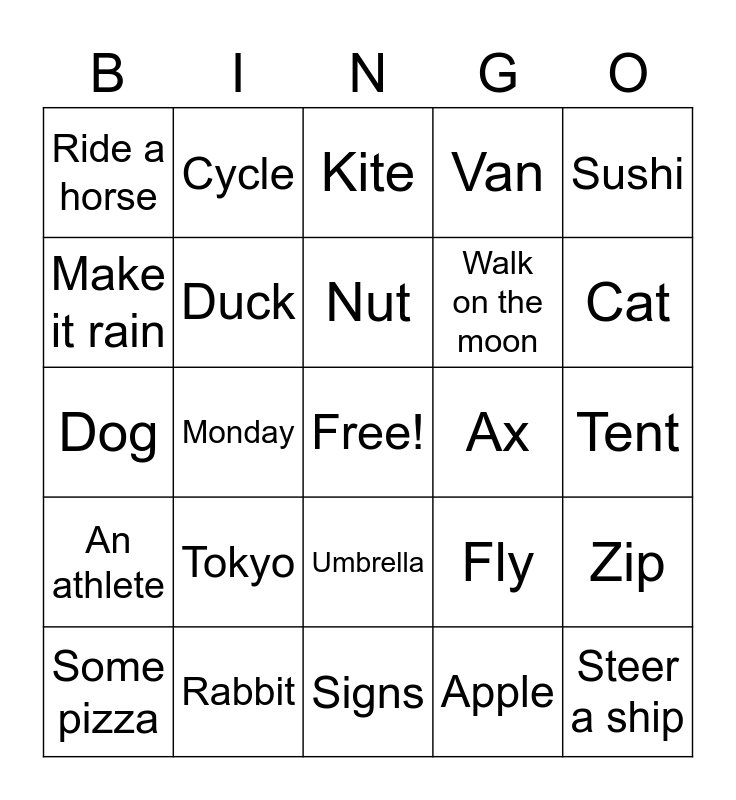 This bingo card has a free space and 27 words: Fly, Bake cookies, Walk on the moon, Signs, Make it rain, Kite, Cycle, An athlete, Ax, Zip, Dog, Van, Some pizza, Rabbit, Cat, Fishing, Duck, Nut, Tokyo, Ride a horse, Tent, Apple, Monday, Steer a ship, Umbrella, Sushi and Net.