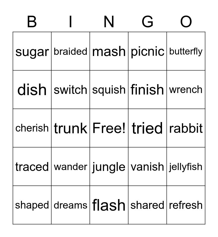 This bingo card has a free space and 24 words: wander, dreams, squish, shaped, butterfly, sugar, dish, braided, tried, jungle, finish, cherish, vanish, jellyfish, switch, shared, rabbit, mash, wrench, trunk, refresh, traced, picnic and flash.