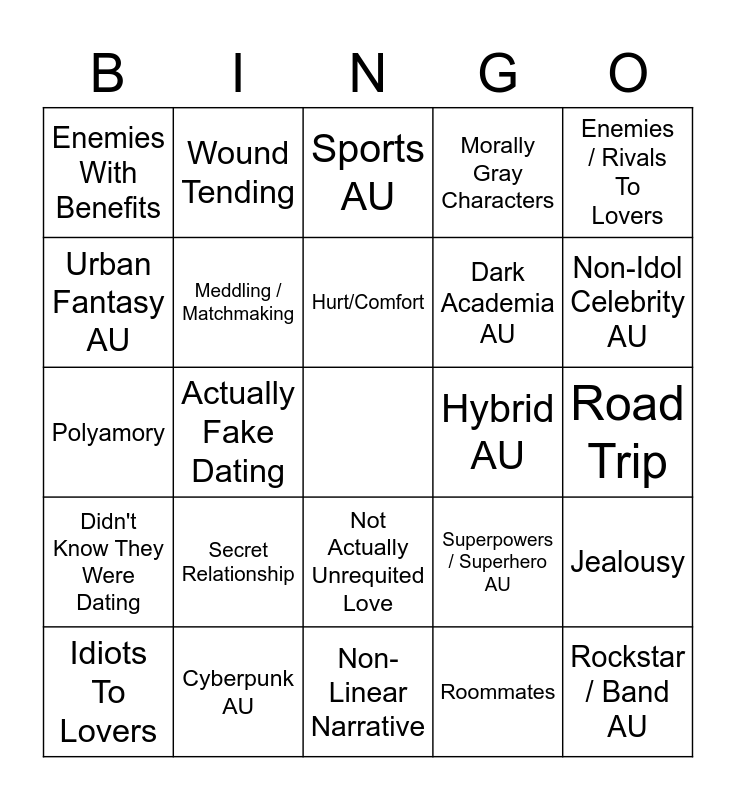 This bingo card has a free space and 97 words: 3+1 / 5+1 Things, Accidental Relationship, Acts Of Service, Actually Fake Dating, Angst With A Happy Ending, Arranged Marriage, Bad Flirting, Banter / Bickering, Based On Other Media, Character Study, Childhood Friends, Childhood Friends To Lovers, Confessions, Didn't Know They Were Dating, Domesticity, Enemies With Benefits, Enemies / Rivals To Lovers, Established Relationship, Exes To Lovers, Fake Relationship, Found Family, Friends To Lovers, Friends With Benefits, Happy Ending, Humor, Hurt/Comfort, Idiots To Lovers, Jealousy, Late-Night Conversations, Love Languages, Meddling / Matchmaking, Morally Gray Characters, Mutual Pining, No One Believes They're Dating, Non-Linear Narrative, Not Actually Unrequited Love, Opposites Attract, Partners In Crime, Pining, Polyamory, Professional Partners To Lovers, Road Trip, Romcom, Roommates, Secret Relationship, Sharing Dreams, Slice Of Life, Slow Burn, Soulmates, Strangers To Lovers, Stuck Together / Forced Proximity, Time Loop, Trope Subversion, Unrequited Love, Unrequited Rivalry, Very Obvious A Very Oblivious B, We Kissed Once But We Don't Talk About It, Wound Tending, Angels and Demons AU, Apocalypse / Dystopian AU, Bakery AU, Boarding School AU, Bodyguard AU, Buzzfeed Unsolved AU, Canon Divergent AU, Canon-Compliant AU, Coffee Shop AU, College / University AU, Crime / Criminals AU, Cyberpunk AU, Dark Academia AU, Demigods AU, Fantasy AU, Florist x Tattoo Artist AU, Folklore / Mythology AU, Fraternity AU, Heist AU, Hospital AU, Hybrid AU, Magical AU, Modern With Magic AU, Non-Idol Celebrity AU, Non-Traditional A/B/O AU, Office AU, Omegaverse AU, Road Trip AU, Rockstar / Band AU, Royalty AU, Science Fiction AU, Soulmate AU, Sports AU, Spy AU, Sugar Baby AU, Superpowers / Superhero AU, Urban Fantasy AU, Vampire AU and Werewolf / Shapeshifter AU.