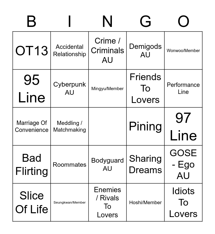 This bingo card has a free space and 128 words: 3+1 / 5+1 Things, Accidental Relationship, Acts Of Service, Actually Fake Dating, Angst With A Happy Ending, Arranged Marriage, Bad Flirting, Banter / Bickering, Based On Other Media, Character Study, Childhood Friends, Childhood Friends To Lovers, Confessions, Didn't Know They Were Dating, Domesticity, Enemies With Benefits, Enemies / Rivals To Lovers, Established Relationship, Exes To Lovers, Fake Relationship, Found Family, Friends To Lovers, Friends With Benefits, Happy Ending, Humor, Hurt/Comfort, Idiots To Lovers, Jealousy, Late-Night Conversations, Love Languages, Marriage Of Convenience, Meddling / Matchmaking, Morally Gray Characters, Mutual Pining, No One Believes They're Dating, Non-Linear Narrative, Not Actually Unrequited Love, Only One Bed, Opposites Attract, Partners In Crime, Pining, Polyamory, Practice Kissing, Professional Partners To Lovers, Right Person Wrong Time, Road Trip, Romcom, Roommates, Secret Relationship, Sharing Dreams, Single Parent, Slice Of Life, Slow Burn, Soulmates, Strangers To Lovers, Stuck Together / Forced Proximity, Time Loop, Trope Subversion, Unrequited Love, Unrequited Rivalry, Very Obvious A Very Oblivious B, We Kissed Once But We Don't Talk About It, Wound Tending, Monogamous Relationship, Poly Relationship, OT13, Vocal Line, Hip Hop Line, Performance Line, 95 Line, 96 Line, 97 Line, Maknae Line, Foreign Line, Booseoksoon, Leaders, Seungcheol/Member, Jeonghan/Member, Joshua/Member, Jun/Member, Hoshi/Member, Wonwoo/Member, Woozi/Member, Dokyeom/Member, Mingyu/Member, Minghao/Member, Seungkwan/Member, Vernon/Member, Dino/Member, Angels and Demons AU, Apocalypse / Dystopian AU, Boarding School AU, Bodyguard AU, Buzzfeed Unsolved AU, Canon Divergent AU, Canon-Compliant AU, College / University AU, Crime / Criminals AU, Cyberpunk AU, Dark Academia AU, Demigods AU, Fantasy AU, Folklore / Mythology AU, GOSE - Bad Clue AU, GOSE - Ego AU, GOSE - Wonwoo's Diary AU, Heist AU, Historical AU, Hospital AU, Hybrid AU, Magical AU, Modern With Magic AU, Non-Idol Celebrity AU, Office AU, Pacific Rim AU, Road Trip AU, Rockstar / Band AU, Royalty AU, Science Fiction AU, Soulmate AU, Sports AU, Spy AU, Sugar Baby AU, Superpowers / Superhero AU, Urban Fantasy AU, Vampire AU, Wedding Planner AU and Werewolf / Shapeshifter AU.