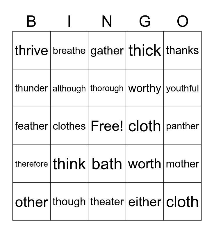 This bingo card has a free space and 24 words: think, though, thorough, other, thanks, thrive, thunder, breathe, cloth, bath, worthy, feather, worth, mother, although, either, panther, gather, youthful, clothes, cloth, therefore, thick and theater.
