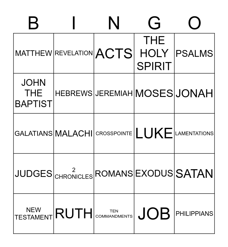 This bingo card has a free space and 24 words: 2 CHRONICLES, RUTH, JEREMIAH, NEW TESTAMENT, PSALMS, MATTHEW, JOHN THE BAPTIST, REVELATION, LUKE, ROMANS, MOSES, GALATIANS, EXODUS, SATAN, HEBREWS, JOB, LAMENTATIONS, ACTS, JONAH, MALACHI, PHILIPPIANS, JUDGES, THE HOLY SPIRIT and TEN COMMANDMENTS.
