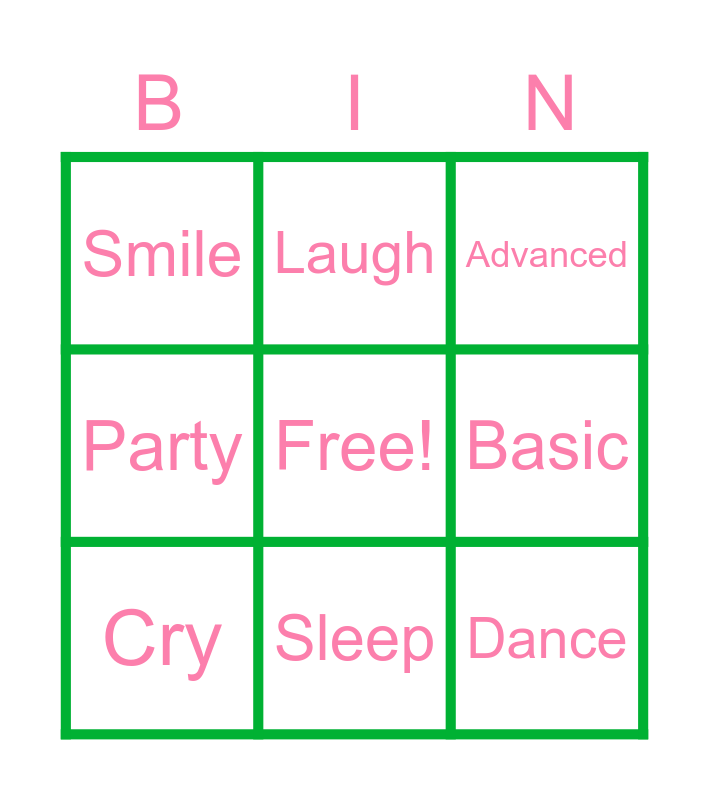 This bingo card has a free space and 8 words: Basic, Advanced, Laugh, Cry, Smile, Dance, Party and Sleep.
