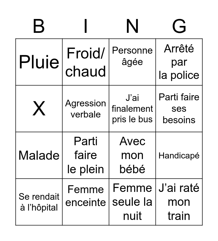 This bingo card has 16 words: Femme enceinte, Handicapé, Personne âgée, Pluie, Malade, Froid/ chaud, Avec mon bébé, Femme seule la nuit, X, Agression verbale, Se rendait à l’hôpital, Arrêté par la police, Parti faire le plein, Parti faire ses besoins, J’ai finalement pris le bus and J’ai raté mon train.