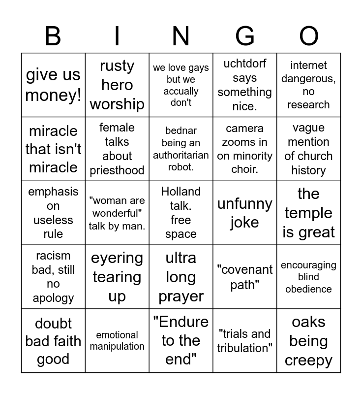 This bingo card has a free space and 24 words: eyering tearing up, emotional manipulation, bednar being an authoritarian robot., doubt bad faith good, internet dangerous, no research, give us money!, miracle that isn't miracle, rusty hero worship, unfunny joke, ultra long prayer, camera zooms in on minority choir., emphasis on useless rule, "covenant path", encouraging blind obedience, female talks about priesthood, "trials and tribulation", the temple is great, we love gays but we accually don't, vague mention of church history, "woman are wonderful" talk by man., oaks being creepy, racism bad, still no apology, uchtdorf says something nice. and "Endure to the end".