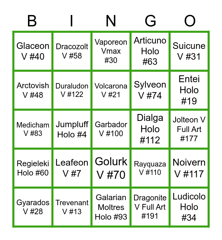 This bingo card has a free space and 24 words: Leafeon V #7, Trevenant V #13, Volcarona V #21, Gyarados V #28, Suicune V #31, Glaceon V #40, Arctovish V #48, Dracozolt V #58, Dialga Holo #112, Golurk V #70, Sylveon V #74, Medicham V #83, Rayquaza V #110, Noivern V #117, Duraludon V #122, Dragonite V Full Art #191, Jolteon V Full Art #177, Vaporeon Vmax #30, Entei Holo #19, Jumpluff Holo #4, Ludicolo Holo #34, Regieleki Holo #60, Articuno Holo #63 and Galarian Moltres Holo #93.