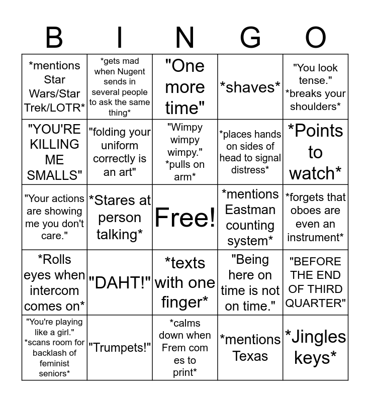 This bingo card has a free space and 24 words: "DAHT!", "Trumpets!", "Wimpy wimpy wimpy." *pulls on arm*, "You're playing like a girl." *scans room for backlash of feminist seniors*, "You look tense." *breaks your shoulders*, *mentions Star Wars/Star Trek/LOTR*, "YOU'RE KILLING ME SMALLS", *gets mad when Nugent sends in several people to ask the same thing*, *mentions Eastman counting system*, *texts with one finger*, *places hands on sides of head to signal distress*, "Your actions are showing me you don't care.", "Being here on time is not on time.", "BEFORE THE END OF THIRD QUARTER", "folding your uniform correctly is an art", *mentions Texas, *forgets that oboes are even an instrument*, "One more time", *Points to watch*, *Stares at person talking*, *Jingles keys*, *Rolls eyes when intercom comes on*, *shaves* and *calms down when Frem comes to print*.
