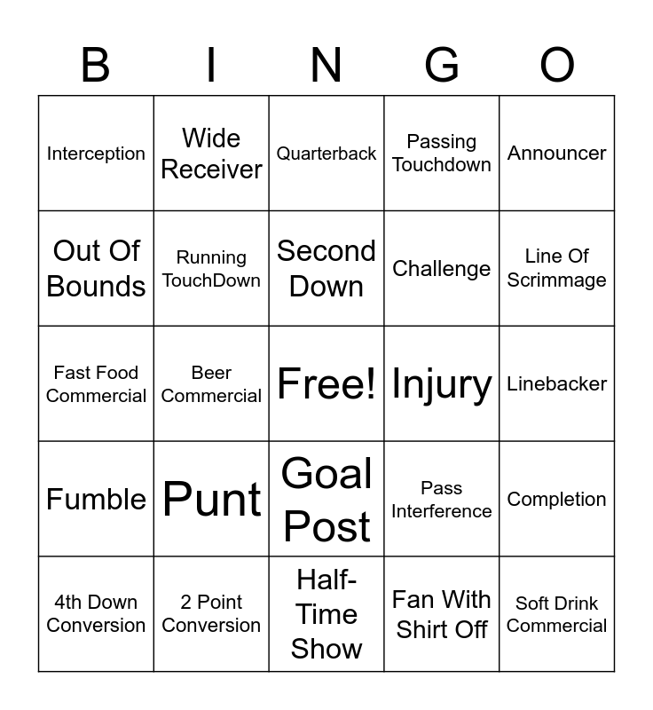 This bingo card has a free space and 65 words: Timeout, One Hand Catch, Sack, Completion, Jersey, Tailgate, Wide Receiver, First Down, Second Down, Throw, Goal Post, 2 MInute Warning, Linebacker, Announcer, Kick Off, Out Of Bounds, Beer Commercial, Interception, Offsides, Challenge, Punt, Fumble, Passing Touchdown, Incomplete Pass, Fair Catch, Field Goal, Missed Field Goal, Cheerleader, Soft Drink Commercial, False Start, 4th Down Conversion, Delay Of Game, Personal Foul, Huddle, Pass Interference, 2 Point Conversion, Fan With Face Painted, Fast Food Commercial, Fan With Shirt Off, Extra Point, Running TouchDown, Interception, Injury, Holding, Safety, Blitz, Line Of Scrimmage, Snap, Instant Replay, Red Zone, Spike, Sunday Night FootBall, Food Comercial, Half-Time Show, Coverage, Game Clock, Kneel Down, Quarterback, Tackle, Tight End, End Zone, Kickoff, Offensive Line, Down and Pocket.