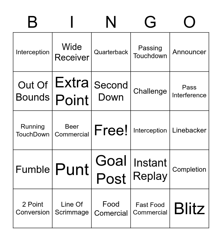 This bingo card has a free space and 64 words: Timeout, One Hand Catch, Sack, Completion, Jersey, Tailgate, Wide Receiver, First Down, Second Down, Throw, Goal Post, 2 MInute Warning, Linebacker, Announcer, Kick Off, Out Of Bounds, Beer Commercial, Interception, Offsides, Challenge, Punt, Fumble, Passing Touchdown, Incomplete Pass, Fair Catch, Field Goal, Missed Field Goal, Cheerleader, Soft Drink Commercial, False Start, 4th Down Conversion, Delay Of Game, Personal Foul, Huddle, Pass Interference, 2 Point Conversion, Fan With Face Painted, Fast Food Commercial, Fan With Shirt Off, Extra Point, Running TouchDown, Interception, Injury, Holding, Safety, Blitz, Line Of Scrimmage, Snap, Instant Replay, Red Zone, Spike, Sunday Night FootBall, Food Comercial, Half-Time Show, Game Clock, Kneel Down, Quarterback, Tackle, Tight End, End Zone, Kickoff, Offensive Line, Down and Pocket.