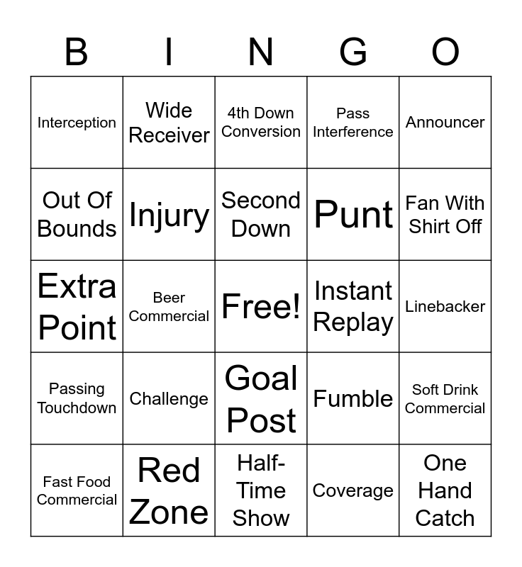 This bingo card has a free space and 68 words: Timeout, One Hand Catch, Sack, Completion, Jersey, Tailgate, Wide Receiver, First Down, Second Down, Throw, Goal Post, 2 Minute Warning, Linebacker, Announcer, Kick Off, Out Of Bounds, Beer Commercial, Interception, Offsides, Challenge, Punt, Fumble, Passing Touchdown, Incomplete Pass, Fair Catch, Field Goal, Missed Field Goal, Cheerleader, Soft Drink Commercial, False Start, 4th Down Conversion, Delay Of Game, Personal Foul, Huddle, Pass Interference, 2 Point Conversion, Fan With Face Painted, Fast Food Commercial, Fan With Shirt Off, Extra Point, Running TouchDown, Interception, Injury, Holding, Safety, Blitz, Line Of Scrimmage, Snap, Instant Replay, Red Zone, Spike, Sunday Night FootBall, Food Commercial, Half-Time Show, Defense, Rush, Coverage, Penalty, Game Clock, Kneel Down, Quarterback, Tackle, Tight End, End Zone, Kickoff, Offensive Line, Down and Pocket.