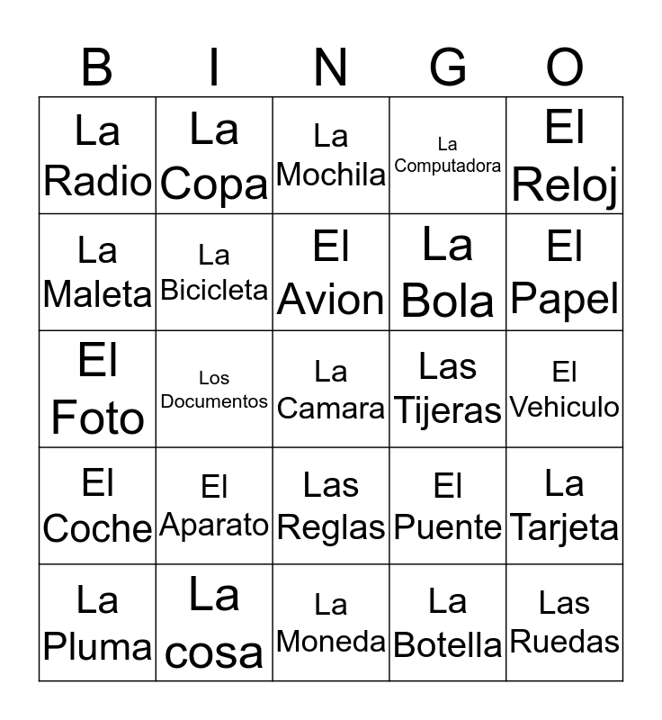 This bingo card has 61 words: Free!, La cosa, Las Llaves, El Coche, La Botella, El Mapa, La Bicicleta, Los Boligrafos, La Bola, El Dinero, La Computadora, El Celular, La Maleta, El Tren, La Moto, La Radio, La Camara, El Reloj, El Barco, El Avion, Las Tijeras, La Mochila, La Pluma, La Tarjeta, La Bateria, La Campana, El Papel, Los Dólares, El Papel, La Fuente, El Objecto, Las Páginas, El Aceite, La Revista, La Copa, El Periódico, La Cadena, Los Documentos, La Caja, El Foto, La Bolsa, El Aparato, El Vehiculo, El Alcohol, El Puente, La Pantalla, La pieza, El Polvo, La Máquina, Las Reglas, La Moneda, El Auto, El Motor, La Columna, La Bandera, La Bomba, El Arma, La Lista, Las Notas, Las Ruedas and El Autobús.