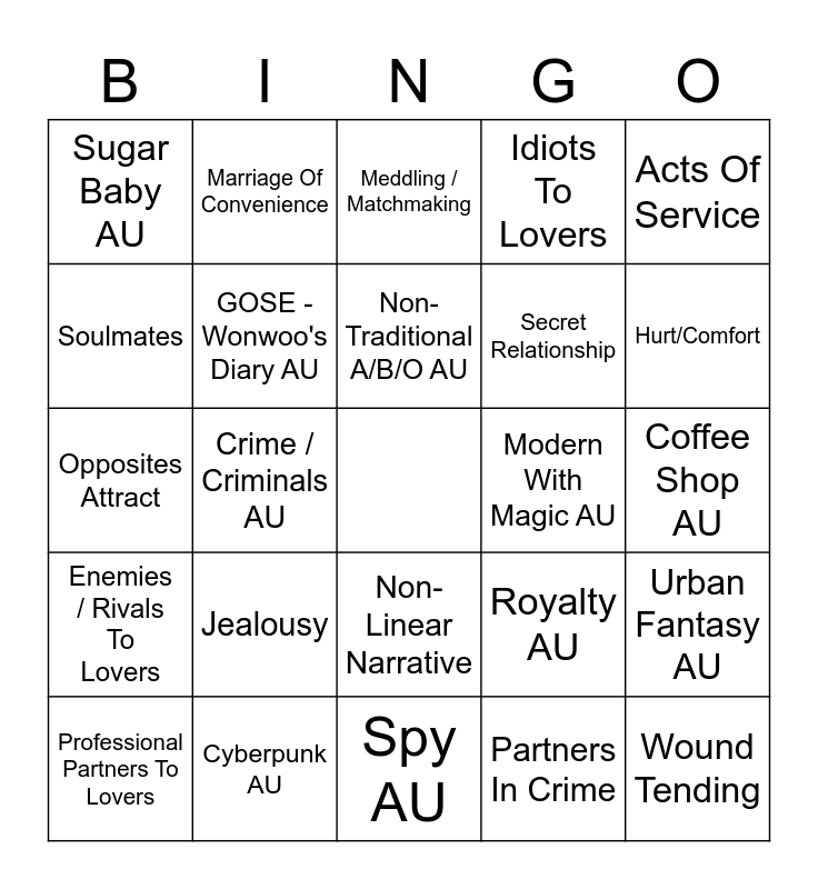 This bingo card has a free space and 102 words: 3+1 / 5+1 Things, Accidental Relationship, Acts Of Service, Actually Fake Dating, Angst With A Happy Ending, Arranged Marriage, Bad Flirting, Banter / Bickering, Based On Other Media, Character Study, Childhood Friends, Childhood Friends To Lovers, Confessions, Didn't Know They Were Dating, Domesticity, Enemies With Benefits, Enemies / Rivals To Lovers, Established Relationship, Exes To Lovers, Fake Relationship, Found Family, Friends To Lovers, Friends With Benefits, Happy Ending, Humor, Hurt/Comfort, Idiots To Lovers, Jealousy, Late-Night Conversations, Love Languages, Marriage Of Convenience, Meddling / Matchmaking, Morally Gray Characters, Mutual Pining, No One Believes They're Dating, Non-Linear Narrative, Not Actually Unrequited Love, Only One Bed, Opposites Attract, Partners In Crime, Pining, Practice Kissing, Professional Partners To Lovers, Right Person Wrong Time, Road Trip, Romcom, Roommates, Secret Relationship, Sharing Dreams, Single Parent, Slice Of Life, Slow Burn, Soulmates, Strangers To Lovers, Stuck Together / Forced Proximity, Time Loop, Trope Subversion, Very Obvious A Very Oblivious B, We Kissed Once But We Don't Talk About It, Wound Tending, Angels and Demons AU, Apocalypse / Dystopian AU, Bakery AU, Bodyguard AU, Buzzfeed Unsolved AU, Canon Divergent AU, Canon-Compliant AU, Coffee Shop AU, Crime / Criminals AU, Cyberpunk AU, Demigods AU, Fantasy AU, Florist x Tattoo Artist AU, Folklore / Mythology AU, GOSE - Bad Clue AU, GOSE - Ego AU, GOSE - Wonwoo's Diary AU, Heist AU, Historical AU, Hospital AU, Hybrid AU, Lawyers AU, Magical AU, Modern With Magic AU, Non-Idol Celebrity AU, Non-Traditional A/B/O AU, Office AU, Omegaverse AU, Pacific Rim AU, Road Trip AU, Rockstar / Band AU, Royalty AU, Science Fiction AU, Soulmate AU, Sports AU, Spy AU, Sugar Baby AU, Superpowers / Superhero AU, Urban Fantasy AU, Vampire AU, Wedding Planner AU and Werewolf / Shapeshifter AU.