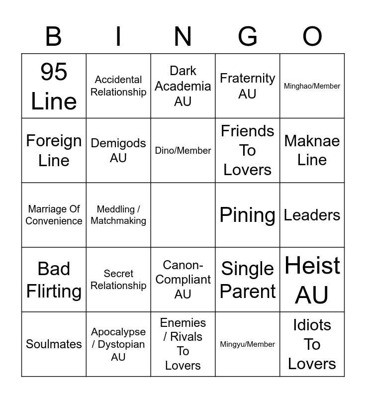 This bingo card has a free space and 130 words: 3+1 / 5+1 Things, Accidental Relationship, Acts Of Service, Actually Fake Dating, Angst With A Happy Ending, Arranged Marriage, Bad Flirting, Banter / Bickering, Based On Other Media, Character Study, Childhood Friends, Childhood Friends To Lovers, Confessions, Didn't Know They Were Dating, Domesticity, Enemies With Benefits, Enemies / Rivals To Lovers, Established Relationship, Exes To Lovers, Fake Relationship, Found Family, Friends To Lovers, Friends With Benefits, Happy Ending, Humor, Hurt/Comfort, Idiots To Lovers, Jealousy, Late-Night Conversations, Love Languages, Marriage Of Convenience, Meddling / Matchmaking, Morally Gray Characters, Mutual Pining, No One Believes They're Dating, Non-Linear Narrative, Not Actually Unrequited Love, Only One Bed, Opposites Attract, Partners In Crime, Pining, Polyamory, Practice Kissing, Professional Partners To Lovers, Road Trip, Romcom, Roommates, Secret Relationship, Sharing Dreams, Single Parent, Slice Of Life, Soulmates, Strangers To Lovers, Stuck Together / Forced Proximity, Trope Subversion, Unrequited Rivalry, Very Obvious A Very Oblivious B, We Kissed Once But We Don't Talk About It, Wound Tending, Monogamous Relationship, Poly Relationship, OT13, Vocal Line, Hip Hop Line, Performance Line, 95 Line, 96 Line, 97 Line, Maknae Line, Foreign Line, Booseoksoon, Leaders, Seungcheol/Member, Jeonghan/Member, Joshua/Member, Jun/Member, Hoshi/Member, Wonwoo/Member, Woozi/Member, Dokyeom/Member, Mingyu/Member, Minghao/Member, Seungkwan/Member, Vernon/Member, Dino/Member, Angels and Demons AU, Apocalypse / Dystopian AU, Bakery AU, Boarding School AU, Bodyguard AU, Buzzfeed Unsolved AU, Canon Divergent AU, Canon-Compliant AU, Coffee Shop AU, College / University AU, Crime / Criminals AU, Cyberpunk AU, Dark Academia AU, Demigods AU, Fantasy AU, Florist x Tattoo Artist AU, Folklore / Mythology AU, Fraternity AU, GOSE - Bad Clue AU, GOSE - Ego AU, GOSE - Wonwoo's Diary AU, Heist AU, Historical AU, Hospital AU, Hybrid AU, Lawyers AU, Magical AU, Modern With Magic AU, Non-Idol Celebrity AU, Non-Traditional A/B/O AU, Office AU, Omegaverse AU, Pacific Rim AU, Rockstar / Band AU, Royalty AU, Science Fiction AU, Soulmate AU, Sports AU, Spy AU, Sugar Baby AU, Superpowers / Superhero AU, Urban Fantasy AU, Vampire AU, Wedding Planner AU and Werewolf / Shapeshifter AU.