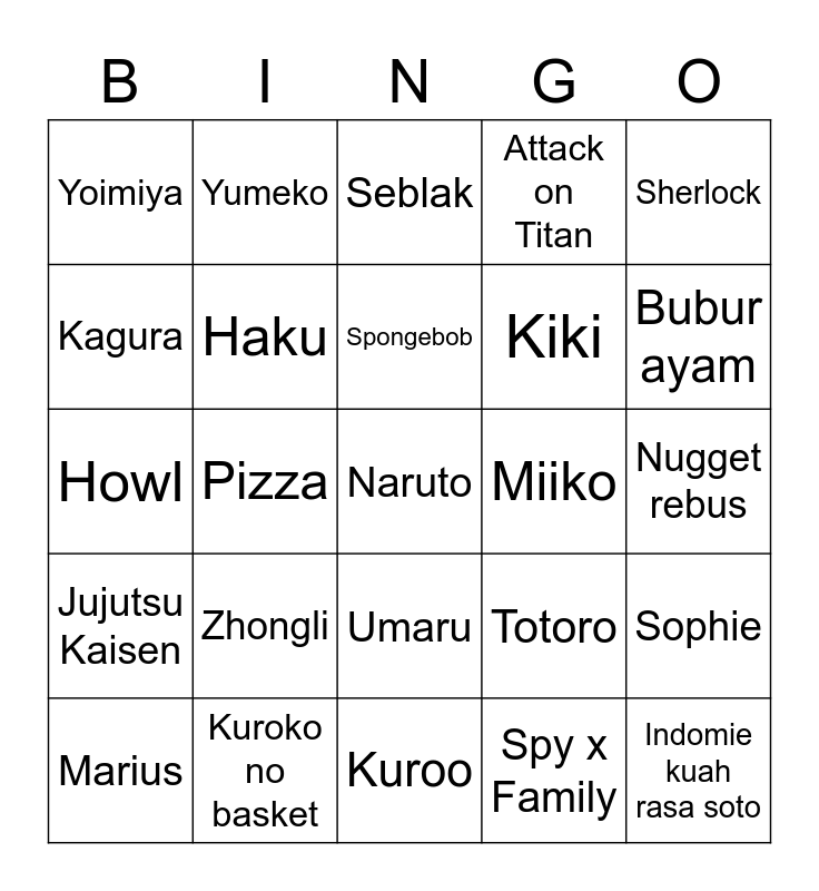 This bingo card has 25 words: Zhongli, Kuroo, Spongebob, Marius, Sherlock, Yoimiya, Kagura, Yumeko, Miiko, Umaru, Kiki, Howl, Totoro, Sophie, Haku, Indomie kuah rasa soto, Nugget rebus, Seblak, Bubur ayam, Pizza, Naruto, Kuroko no basket, Jujutsu Kaisen, Attack on Titan and Spy x Family.