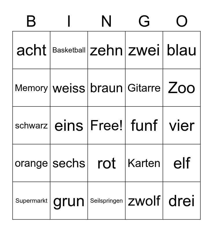 This bingo card has a free space and 40 words: violet, schwarz, gelb, weiss, grun, rot, braun, grau, blau, orange, eins, zwei, drei, vier, funf, sechs, sieben, acht, neun, zehn, elf, zwolf, Gitarre, Memory, Mathematik, Verstecken, Zebra, Fussball, CD, Fangen, Schwarzer Peter, Supermarkt, Tischtennis, Karten, Zoo, Seilspringen, Pullover, Wurfeln, Basketball and Telefon.