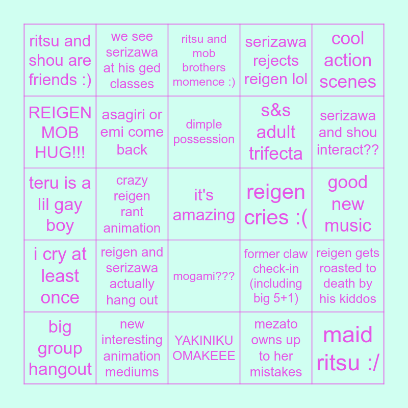 This bingo card has a free space and 24 words: reigen and serizawa actually hang out, new interesting animation mediums, dimple possession, big group hangout, cool action scenes, ritsu and shou are friends :), REIGEN MOB HUG!!!, we see serizawa at his ged classes, reigen cries :(, mogami???, s&s adult trifecta, teru is a lil gay boy, former claw check-in (including big 5+1), reigen gets roasted to death by his kiddos, asagiri or emi come back, mezato owns up to her mistakes, good new music, ritsu and mob brothers momence :), serizawa and shou interact??, crazy reigen rant animation, maid ritsu :/, i cry at least once, serizawa rejects reigen lol and YAKINIKU OMAKEEE.