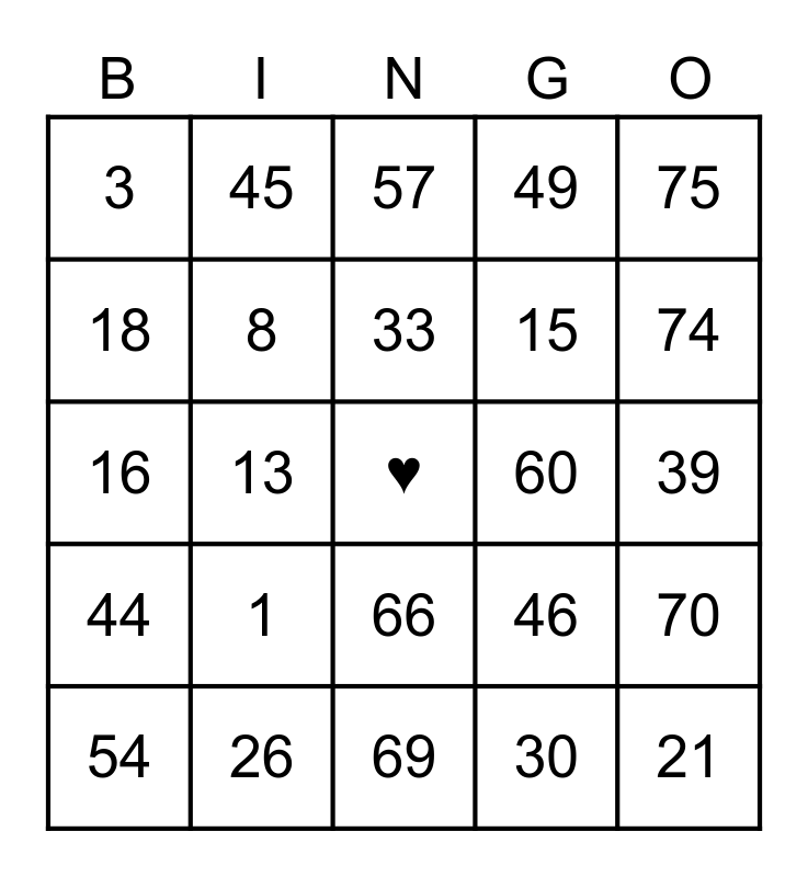This bingo card has a free space and 24 words: 1, 26, 33, 54, 75, 3, 18, 45, 60, 66, 15, 16, 46, 70, 8, 30, 39, 57, 74, 13, 21, 44, 49 and 69.