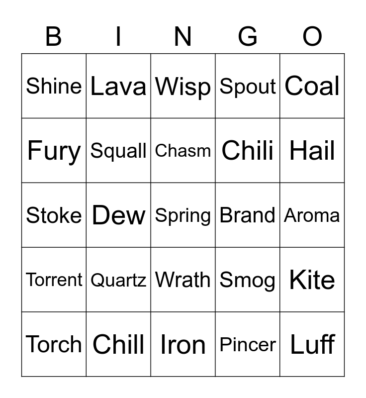 This bingo card has 25 words: Quartz, Iron, Chasm, Torch, Coal, Shine, Fury, Lava, Brand, Wrath, Chili, Stoke, Smog, Kite, Squall, Luff, Aroma, Wisp, Hail, Dew, Spring, Chill, Torrent, Spout and Pincer.