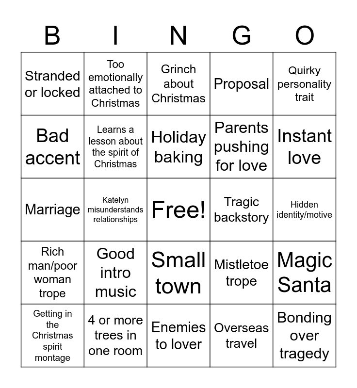This bingo card has a free space and 28 words: Magic Santa, Reluctant love, Parents pushing for love, Overseas travel, Bad accent, Grinch about Christmas, Too emotionally attached to Christmas, Rich man/poor woman trope, Tragic backstory, Getting in the Christmas spirit montage, Marriage, Proposal, 4 or more trees in one room, Enemies to lover, Instant love, City montage opening, Good intro music, Learns a lesson about the spirit of Christmas, Holiday baking, Small town, Stranded or locked, Transport trouble, Bonding over tragedy, Katelyn misunderstands relationships, Hidden identity/motive, Mistletoe trope, Quirky personality trait and Bad child actor.