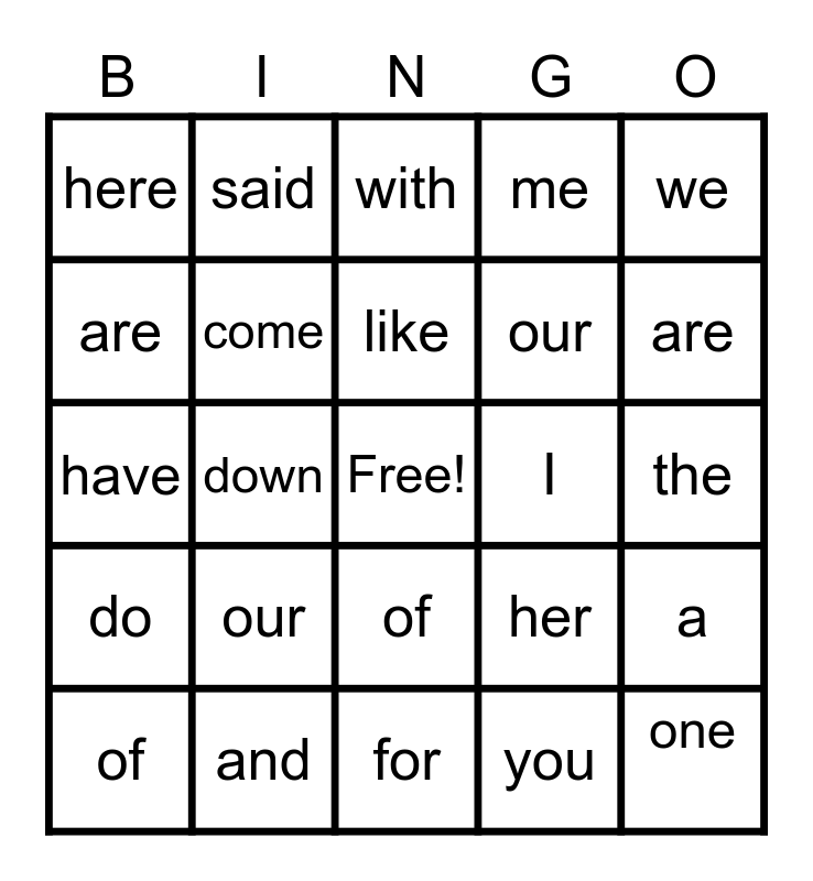 This bingo card has a free space and 24 words: of, our, like, you, we, here, said, with, I, the, have, come, her, a, are, and, for, me, are, do, down, of, our and one.