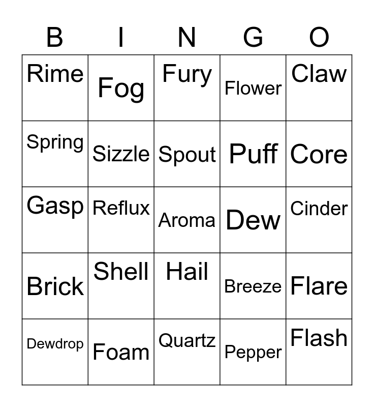 This bingo card has a free space and 24 words: Shell, Foam, Spout, Dewdrop, Claw, Rime, Spring, Fog, Dew, Hail, Puff, Gasp, Breeze, Flare, Sizzle, Pepper, Cinder, Fury, Core, Reflux, Flash, Brick, Flower and Quartz.