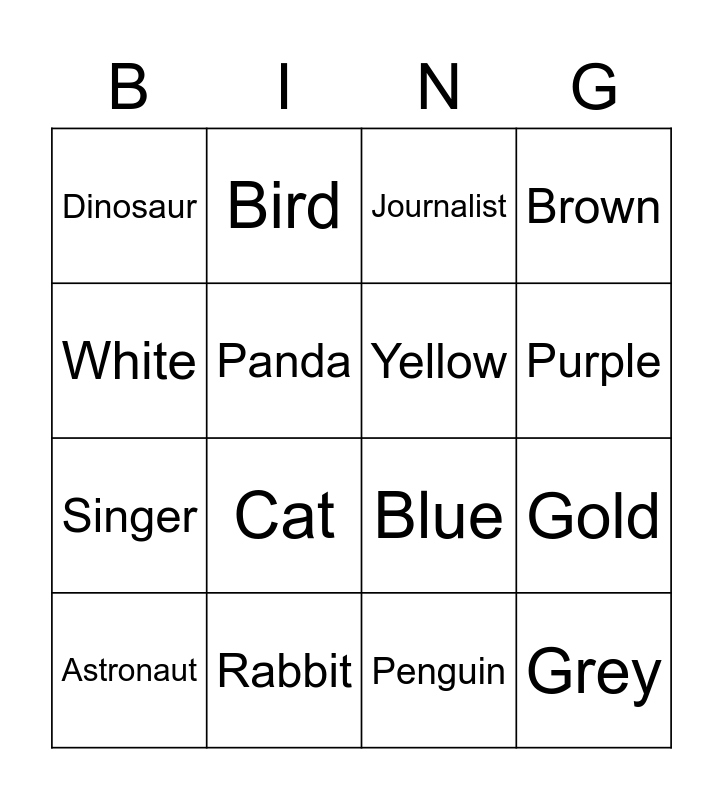 This bingo card has 40 words: Red, Blue, Green, Yellow, Silver, Pink, Purple, Black, White, Grey, Gold, Brown, Astronaut, Penguin, Rabbit, Cowboy, Bear, Dinosaur, Ballet Dancer, Journalist, Dancer, Actor, Singer, Panda, Hippo, Skirt, Mask, Helmet, Jeans, Shoes, Shirt, Hoodie, Suit, Dog, Cat, Horse, Hamster, Fish, Bird and Turtle.