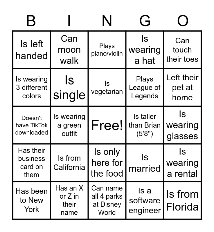 This bingo card has a free space and 24 words: Is from California, Has an X or Z in their name, Is vegetarian, Has been to New York, Can touch their toes, Is left handed, Is wearing 3 different colors, Can moon walk, Is taller than Brian (5'8''), Is only here for the food, Plays League of Legends, Doesn't have TikTok downloaded, Is married, Is wearing a rental, Is single, Is a software engineer, Is wearing glasses, Plays piano/violin, Left their pet at home, Is wearing a green outfit, Is from Florida, Has their business card on them, Is wearing a hat and Can name all 4 parks at Disney World.
