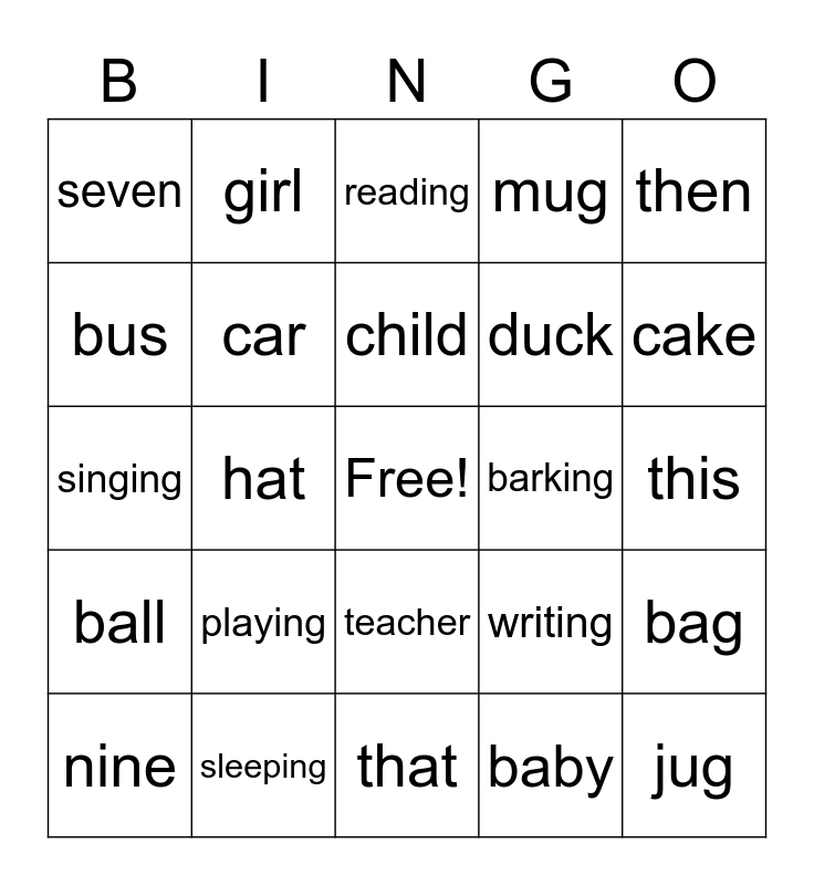 This bingo card has a free space and 34 words: eight, baby, picture, bike, ball, car, then, nine, girl, boy, child, reading, eating, purring, barking, cake, sleeping, singing, playing, writing, teacher, barking, seven, this, that, jug, mug, cup, duck, bus, flag, hat, bag and cap.
