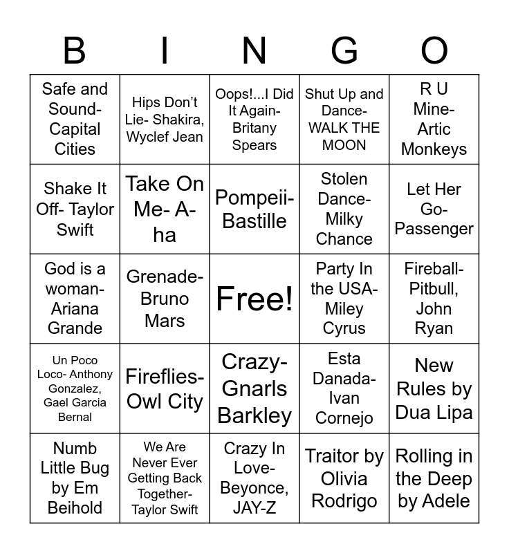 This bingo card has a free space and 61 words: Abcdefu (nicer), We Are Never Ever Getting Back Together- Taylor Swift, Watermelon sugar- Harry Styles, Un Poco Loco- Anthony Gonzalez, Gael Garcia Bernal, Traitor by Olivia Rodrigo, This Love- Maroon 5, Take On Me- A-ha, Sucker by Jonas Brothers, Stolen Dance- Milky Chance, Sk8er Boi- Avril Lavine, Shut Up and Dance- WALK THE MOON, Shallow by Lady Gaga and Bradley Cooper, Shake It Off- Taylor Swift, September- Earth, Wind, & Fire, Save Your Tears- The Weeknd, Safe and Sound- Capital Cities, Rolling in the Deep by Adele, R U Mine- Artic Monkeys, Pon de Replay- Rihanna, Pompeii- Bastille, Party In the USA- Miley Cyrus, Oops!...I Did It Again- Britany Spears, Numb Little Bug by Em Beihold, New Rules by Dua Lipa, Never Gonna Give You Up- Rick Astley, Mr. Brightside- The Killers, Mirrors- Justin Timberlake, Middle of the night-Elley Duhe, Let Her Go- Passenger, Inferno by Sub Urban and Bella Poarch, Ignorance- Paramore, I Write Sins Not Tragedies- PATD!, How bad can I be?- Ed Helms, The Lorax Singers, Hot Wings(I wanna party)-Will.i.am.,Jamie Foxx,Anne Hathaway, Hips Don’t Lie- Shakira, Wyclef Jean, Hayloft- Mother Mother, Happy- Pharell, Grenade- Bruno Mars, Good Time- Owl City, Carly Rae Jepsen, God is a woman- Ariana Grande, Firework- Katy Perry, Fireflies- Owl City, Fireball- Pitbull, John Ryan, Feel So Close- Calvin Harris, Esta Danada- Ivan Cornejo, Dynamite- Taio Cruz, Don’t Worry Be Happy- Bobby McFerrin, Don’t Stop Believin’ by Journey, Cry me a river- Justin Timberlake, Crazy- Gnarls Barkley, Crazy In Love- Beyonce, JAY-Z, Cloud 9-Beach Bunny, Calling all the monsters- China Anne McClain, Boyfriend- Big Time Rush, Beggin’ by Maneskin, Bam Bam by Camila Cabello, Bad Moon Rising- Creedence Clearwater Revival, Baby- Justin Beiber, Ludacris, As it was- Harry Styles, Arcade by Duncan Laurence and Am I Wrong- Nico & Vinz.