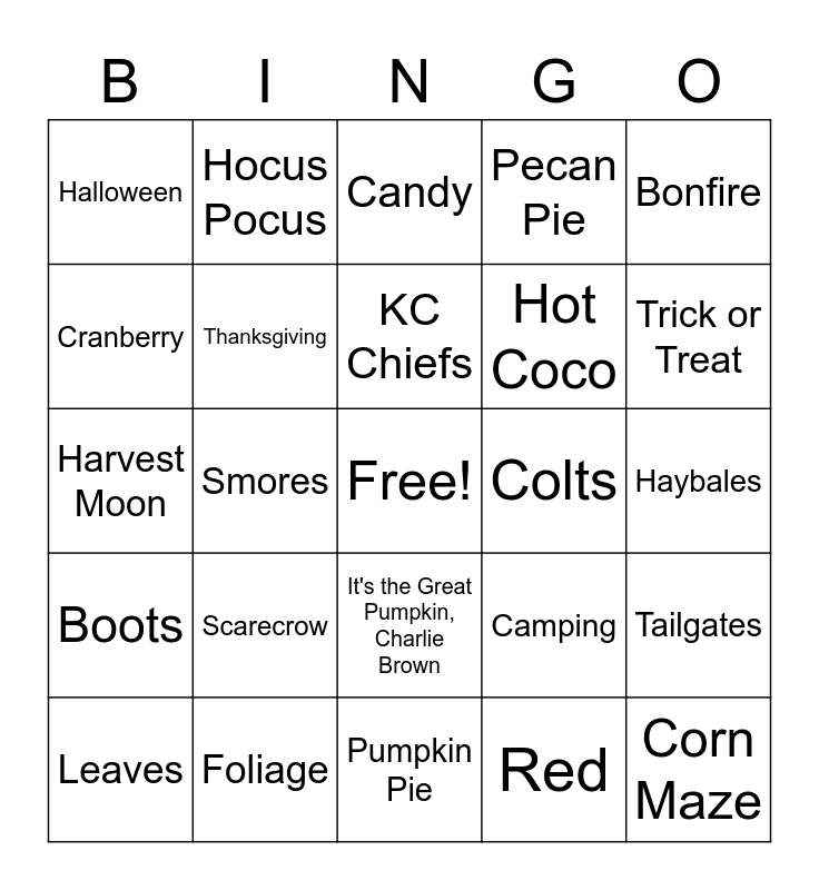 This bingo card has a free space and 29 words: Leaves, Shopping, Smores, Windy, Halloween, Candy, Thanksgiving, Scarecrow, Colts, Foliage, Haybales, Corn Maze, Pumpkin Pie, Red, Trick or Treat, Chilly, It's the Great Pumpkin, Charlie Brown, Boots, Bonfire, Harvest Moon, Camping, Cozy, Hot Coco, Cranberry, Pecan Pie, Hocus Pocus, Tailgates, KC Chiefs and it's CORN.