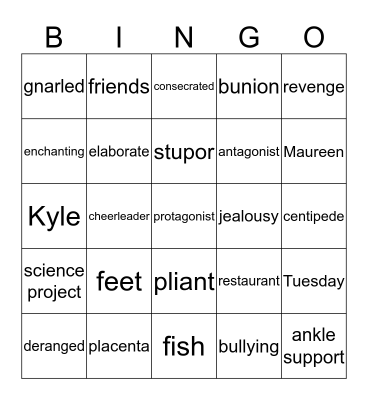This bingo card has a free space and 24 words: feet, placenta, stupor, deranged, revenge, gnarled, enchanting, friends, jealousy, pliant, antagonist, Kyle, restaurant, Tuesday, elaborate, bullying, centipede, consecrated, Maureen, cheerleader, ankle support, science project, bunion and fish.