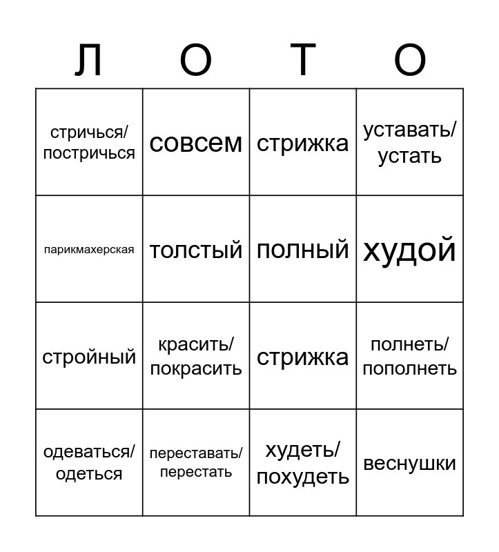 This bingo card has 40 words: внешность, стрижка, фигура, полный, стройный, толстый, худой, тонкий, парикмахерская, веснушки, полнеть/пополнеть, уставать/устать, одеваться/одеться, худеть/похудеть, переставать/перестать, отдыхать/отдохнуть, красить/покрасить, стричься/постричься, внешность, стрижка, фигура, полный, стройный, толстый, худой, тонкий, парикмахерская, веснушки, полнеть/пополнеть, уставать/устать, одеваться/одеться, худеть/похудеть, переставать/перестать, отдыхать/отдохнуть, красить/покрасить, стричься/постричься, достаточно, совершенно, совсем and слишком.