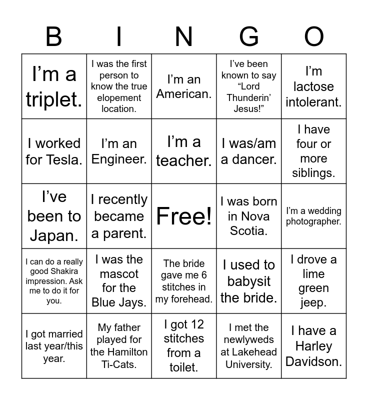 This bingo card has a free space and 33 words: I’m a firefighter., I work/worked for the City of Toronto., I recently became a parent., I am/was a nurse., I can do a really good Shakira impression. Ask me to do it for you., I’m an Engineer., I’m lactose intolerant., I got married last year/this year., I was the first person to know the true elopement location., I play Lacrosse for Western University., I’m a teacher., I’m an American., I’m studying to become an Epidemiologist., I’m a psychometrician., I was born in Nova Scotia., I have four or more siblings., My father played for the Hamilton Ti-Cats., I’ve been to Japan., I was the mascot for the Blue Jays., I used to babysit the bride., The bride gave me 6 stitches in my forehead., I’ve broken 80 in Golf., I’m a triplet., I’m a wedding photographer., I got 12 stitches from a toilet., I have a Harley Davidson., I’ve been known to say “Lord Thunderin’ Jesus!”, I was/am a dancer., I worked for Tesla., I drove a lime green jeep., Je parle français., I met the newlyweds at Lakehead University. and I’ve lived in Ottawa..