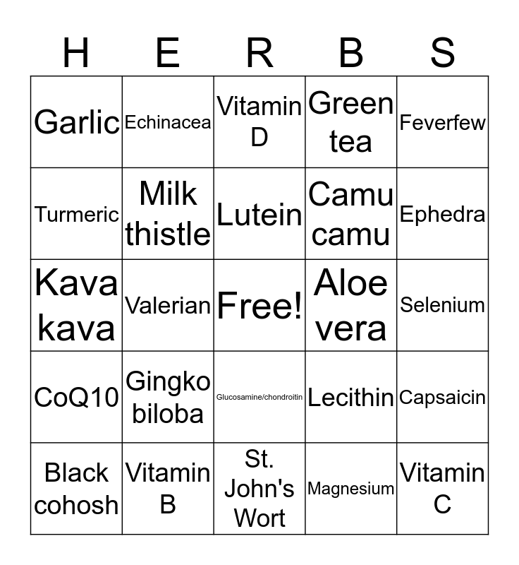 This bingo card has a free space and 24 words: Gingko biloba, Vitamin B, Lutein, Black cohosh, Feverfew, Garlic, Turmeric, Echinacea, Aloe vera, Glucosamine/chondroitin, Camu camu, Kava kava, Lecithin, Capsaicin, Milk thistle, Magnesium, Selenium, Vitamin D, Ephedra, Valerian, Vitamin C, CoQ10, Green tea and St. John's Wort.