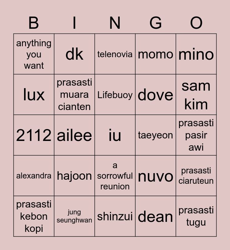 This bingo card has a free space and 24 words: hajoon, jung seunghwan, Lifebuoy, prasasti kebon kopi, mino, anything you want, lux, dk, taeyeon, a sorrowful reunion, dove, 2112, nuvo, prasasti ciaruteun, prasasti muara cianten, dean, prasasti pasir awi, telenovia, sam kim, ailee, prasasti tugu, alexandra, momo and shinzui.