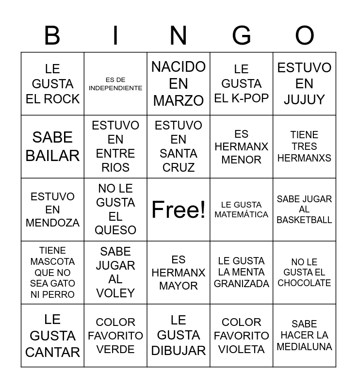 This bingo card has a free space and 80 words: NACIDO EN ENERO, NACIDO EN FEBRERO, NACIDO EN MARZO, NACIDO EN ABRIL, NACIDO EN MAYO, NACIDO EN JUNIO, NACIDO EN JULIO, NACIDO EN AGOSTO, NACIDO EN SEPTIEMBRE, NACIDO EN OCTUBRE, NACIDO EN NOVIEMBRE, NACIDO EN DICIEMBRE, LE GUSTA EL K-POP, LE GUSTA EL ROCK, TOCA UN INSTRUMENTO, SABE BAILAR, SABE JUGAR AL FÚTBOL, SABE JUGAR AL VOLEY, SABE JUGAR AL HANDBALL, SABE JUGAR AL BASKETBALL, ESTUVO EN SALTA, ESTUVO EN JUJUY, ESTUVO EN MENDOZA, ESTUVO EN SANTA CRUZ, ESTUVO EN ENTRE RIOS, ESTUVO EN MISIONES, ESTUVO EN CÓRDOBA, NACIÓ EN OTRA PROVINCIA, TIENE UN HERMANX, TIENE DOS HERMANXS, TIENE TRES HERMANXS, SABE JUGAR AL AJEDREZ, LE GUSTA DIBUJAR, LE GUSTA PINTAR, LE GUSTA CANTAR, LE GUSTA MATEMÁTICA, LE GUSTA INGLÉS, LE GUSTA EDUCACIÓN FÍSICA, ESTUVO FUERA DEL PAIS, SABE HACER LA MEDIALUNA, SABE COCINAR, LE GUSTA MARVEL, LE GUSTA DC, ES DE BOCA, ES DE RIVER, ES DE INDEPENDIENTE, ES DE SAN LORENZO, ES DE RACING, VIVE EN SAN VICENTE, VIVE EN CANNING, NO LE GUSTA EL CHOCOLATE, NO LE GUSTA EL QUESO, LE GUSTA LA MENTA GRANIZADA, GANÓ UN CONCURSO, PUEDE CORRER 2 KILÓMETROS, NO TIENE FACEBOOK, NO TIENE TIKTOK, NO TIENE INSTAGRAM, LE GUSTA LEER, ES HERMANX MAYOR, ES HERMANX MENOR, ES HIJO ÚNICO, USA LENTES, SE QUEBRÓ ALGUNA VEZ, PUEDE TOCAR SUS DEDOS DE LOS PIES, LE GUSTAN LAS FRUTILLAS, NO LE GUSTA EL DULCE DE LECHE, ES ZURDO, TIENE UN PERRO, TIENE UN GATO, TIENE MASCOTA QUE NO SEA GATO NI PERRO, COLOR FAVORITO VERDE, COLOR FAVORITO ROJO, COLOR FAVORITO AZUL, COLOR FAVORITO NARANJA, COLOR FAVORITO AMARILLO, COLOR FAVORITO VIOLETA, TOMA MATE, TOMA CAFÉ and TOMA TÉ.