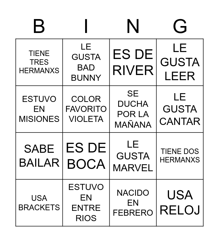 This bingo card has 100 words: Free!, NACIDO EN ENERO, NACIDO EN FEBRERO, NACIDO EN MARZO, NACIDO EN ABRIL, NACIDO EN MAYO, NACIDO EN JUNIO, NACIDO EN JULIO, NACIDO EN AGOSTO, NACIDO EN SEPTIEMBRE, NACIDO EN OCTUBRE, NACIDO EN NOVIEMBRE, NACIDO EN DICIEMBRE, LE GUSTA EL K-POP, LE GUSTA EL ROCK, TOCA UN INSTRUMENTO, SABE BAILAR, SABE JUGAR AL FÚTBOL, SABE JUGAR AL VOLEY, SABE JUGAR AL HANDBALL, SABE JUGAR AL BASKETBALL, ESTUVO EN SALTA, ESTUVO EN JUJUY, ESTUVO EN MENDOZA, ESTUVO EN SANTA CRUZ, ESTUVO EN ENTRE RIOS, ESTUVO EN MISIONES, ESTUVO EN CÓRDOBA, NACIÓ EN OTRA PROVINCIA, TIENE UN HERMANX, TIENE DOS HERMANXS, TIENE TRES HERMANXS, SABE JUGAR AL AJEDREZ, LE GUSTA DIBUJAR, LE GUSTA PINTAR, LE GUSTA CANTAR, LE GUSTA MATEMÁTICA, LE GUSTA INGLÉS, LE GUSTA EDUCACIÓN FÍSICA, ESTUVO FUERA DEL PAIS, SABE HACER LA MEDIALUNA, SABE COCINAR, LE GUSTA MARVEL, LE GUSTA DC, ES DE BOCA, ES DE RIVER, ES DE INDEPENDIENTE, ES DE SAN LORENZO, ES DE RACING, VIVE EN SAN VICENTE, VIVE EN CANNING, NO LE GUSTA EL CHOCOLATE, NO LE GUSTA EL QUESO, LE GUSTA LA MENTA GRANIZADA, GANÓ UN CONCURSO, PUEDE CORRER 2 KILÓMETROS, NO TIENE FACEBOOK, NO TIENE TIKTOK, NO TIENE INSTAGRAM, LE GUSTA LEER, ES HERMANX MAYOR, ES HERMANX MENOR, ES HIJO ÚNICO, USA LENTES, SE QUEBRÓ ALGUNA VEZ, PUEDE TOCAR SUS DEDOS DE LOS PIES, LE GUSTAN LAS FRUTILLAS, NO LE GUSTA EL DULCE DE LECHE, ES ZURDO, TIENE UN PERRO, TIENE UN GATO, TIENE MASCOTA QUE NO SEA GATO NI PERRO, COLOR FAVORITO VERDE, COLOR FAVORITO ROJO, COLOR FAVORITO AZUL, COLOR FAVORITO NARANJA, COLOR FAVORITO AMARILLO, COLOR FAVORITO VIOLETA, TOMA MATE, TOMA CAFÉ, TOMA TÉ, USA BRACKETS, ESTUVO RAPADO ALGUNA VEZ, LE GUSTA TINI, LE GUSTA LALI, LE GUSTA BAD BUNNY, SE COME LAS UÑAS, ESCUCHA PODCASTS, LE GUSTA ESCRIBIR, USA RELOJ, TIENE CALZADO BLANCO, TIENE CALZADO NEGRO, SABE COSER, SE MAQUILLA, SE DUCHA POR LA MAÑANA, SE DUCHA POR LA NOCHE, PRACTICA UN DEPORTE, SABE NADAR, NO DESAPROBÓ NADA EN TODO EL AÑO and SABE UN IDIOMA QUE NO SEA ESPAÑOL NI INGLÉS.
