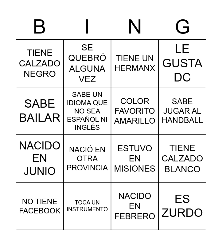 This bingo card has 100 words: Free!, NACIDO EN ENERO, NACIDO EN FEBRERO, NACIDO EN MARZO, NACIDO EN ABRIL, COLOR FAVORITO ROJO, COLOR FAVORITO AZUL, COLOR FAVORITO NARANJA, ESTUVO RAPADO ALGUNA VEZ, LE GUSTA TINI, LE GUSTA LALI, LE GUSTA BAD BUNNY, SE COME LAS UÑAS, ESCUCHA PODCASTS, LE GUSTA ESCRIBIR, NACIDO EN MAYO, NACIDO EN JUNIO, NACIDO EN JULIO, NACIDO EN AGOSTO, NACIDO EN SEPTIEMBRE, NACIDO EN OCTUBRE, NACIDO EN NOVIEMBRE, NACIDO EN DICIEMBRE, LE GUSTA EL K-POP, LE GUSTA EL ROCK, TOCA UN INSTRUMENTO, SABE BAILAR, SABE JUGAR AL FÚTBOL, SABE JUGAR AL VOLEY, USA RELOJ, TIENE CALZADO BLANCO, TIENE CALZADO NEGRO, SABE COSER, SE MAQUILLA, SE DUCHA POR LA MAÑANA, SABE JUGAR AL HANDBALL, SABE JUGAR AL BASKETBALL, ESTUVO EN SALTA, ESTUVO EN JUJUY, ESTUVO EN MENDOZA, ESTUVO EN SANTA CRUZ, ESTUVO EN ENTRE RIOS, ESTUVO EN MISIONES, ESTUVO EN CÓRDOBA, NACIÓ EN OTRA PROVINCIA, TIENE UN HERMANX, TIENE DOS HERMANXS, TIENE TRES HERMANXS, SABE JUGAR AL AJEDREZ, LE GUSTA DIBUJAR, LE GUSTA PINTAR, LE GUSTA CANTAR, LE GUSTA MATEMÁTICA, LE GUSTA INGLÉS, LE GUSTA EDUCACIÓN FÍSICA, ESTUVO FUERA DEL PAIS, SABE HACER LA MEDIALUNA, SABE COCINAR, LE GUSTA MARVEL, LE GUSTA DC, ES DE BOCA, ES DE RIVER, ES DE INDEPENDIENTE, ES DE SAN LORENZO, ES DE RACING, VIVE EN SAN VICENTE, VIVE EN CANNING, NO LE GUSTA EL CHOCOLATE, NO LE GUSTA EL QUESO, NO TIENE TIKTOK, NO TIENE INSTAGRAM, LE GUSTA LEER, ES HERMANX MAYOR, SE DUCHA POR LA NOCHE, PRACTICA UN DEPORTE, SABE NADAR, NO DESAPROBÓ NADA EN TODO EL AÑO, SABE UN IDIOMA QUE NO SEA ESPAÑOL NI INGLÉS, LE GUSTA LA MENTA GRANIZADA, GANÓ UN CONCURSO, PUEDE CORRER 2 KILÓMETROS, NO TIENE FACEBOOK, ES HERMANX MENOR, ES HIJO ÚNICO, USA LENTES, SE QUEBRÓ ALGUNA VEZ, PUEDE TOCAR SUS DEDOS DE LOS PIES, LE GUSTAN LAS FRUTILLAS, NO LE GUSTA EL DULCE DE LECHE, ES ZURDO, TIENE UN PERRO, TIENE UN GATO, TIENE MASCOTA QUE NO SEA GATO NI PERRO, COLOR FAVORITO VERDE, COLOR FAVORITO AMARILLO, COLOR FAVORITO VIOLETA, TOMA MATE, TOMA CAFÉ, TOMA TÉ and USA BRACKETS.
