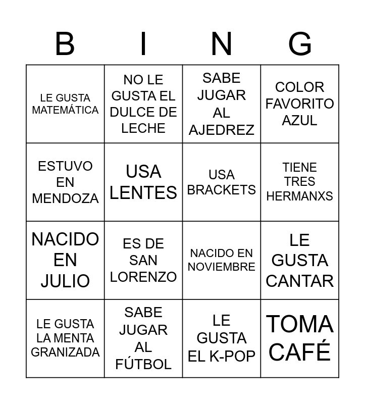 This bingo card has 100 words: Free!, NACIDO EN SEPTIEMBRE, LE GUSTA EL K-POP, LE GUSTA EL ROCK, SE MAQUILLA, SE DUCHA POR LA MAÑANA, SABE JUGAR AL HANDBALL, SABE JUGAR AL VOLEY, TOCA UN INSTRUMENTO, COLOR FAVORITO NARANJA, ESTUVO RAPADO ALGUNA VEZ, LE GUSTA TINI, SABE COSER, USA RELOJ, TIENE CALZADO BLANCO, NACIDO EN JUNIO, NACIDO EN JULIO, NACIDO EN AGOSTO, TIENE CALZADO NEGRO, SABE JUGAR AL BASKETBALL, ESTUVO EN SALTA, ESTUVO EN JUJUY, LE GUSTA LALI, NACIDO EN MARZO, SABE BAILAR, SABE JUGAR AL FÚTBOL, ESTUVO EN MENDOZA, ESTUVO EN CÓRDOBA, NACIÓ EN OTRA PROVINCIA, LE GUSTA MARVEL, LE GUSTA CANTAR, LE GUSTA MATEMÁTICA, TIENE UN HERMANX, TIENE DOS HERMANXS, ESTUVO EN SANTA CRUZ, TIENE TRES HERMANXS, ES DE BOCA, ES DE RIVER, ESTUVO EN MISIONES, LE GUSTA EDUCACIÓN FÍSICA, ESTUVO FUERA DEL PAIS, NACIDO EN OCTUBRE, NACIDO EN NOVIEMBRE, ES DE INDEPENDIENTE, ES DE SAN LORENZO, SABE JUGAR AL AJEDREZ, LE GUSTA DIBUJAR, LE GUSTA PINTAR, ESTUVO EN ENTRE RIOS, NACIDO EN DICIEMBRE, SABE HACER LA MEDIALUNA, SABE COCINAR, LE GUSTA INGLÉS, LE GUSTA DC, ES DE RACING, VIVE EN SAN VICENTE, NACIDO EN FEBRERO, NACIDO EN ABRIL, COLOR FAVORITO ROJO, COLOR FAVORITO AZUL, VIVE EN CANNING, NO LE GUSTA EL CHOCOLATE, GANÓ UN CONCURSO, PUEDE CORRER 2 KILÓMETROS, NO TIENE FACEBOOK, TIENE MASCOTA QUE NO SEA GATO NI PERRO, COLOR FAVORITO VERDE, TIENE UN PERRO, COLOR FAVORITO VIOLETA, TOMA MATE, NO LE GUSTA EL QUESO, NO TIENE TIKTOK, NO TIENE INSTAGRAM, LE GUSTA LEER, ES HERMANX MAYOR, ES HERMANX MENOR, ES HIJO ÚNICO, USA LENTES, SABE NADAR, NO DESAPROBÓ NADA EN TODO EL AÑO, SABE UN IDIOMA QUE NO SEA ESPAÑOL NI INGLÉS, LE GUSTA LA MENTA GRANIZADA, SE QUEBRÓ ALGUNA VEZ, PUEDE TOCAR SUS DEDOS DE LOS PIES, LE GUSTAN LAS FRUTILLAS, NO LE GUSTA EL DULCE DE LECHE, ES ZURDO, SE DUCHA POR LA NOCHE, PRACTICA UN DEPORTE, TOMA CAFÉ, TIENE UN GATO, NACIDO EN ENERO, COLOR FAVORITO AMARILLO, TOMA TÉ, USA BRACKETS, LE GUSTA BAD BUNNY, SE COME LAS UÑAS, ESCUCHA PODCASTS, LE GUSTA ESCRIBIR and NACIDO EN MAYO.
