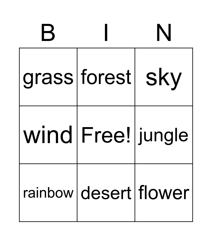 This bingo card has a free space and 24 words: beach, cloud, desert, farm, flower, grass, jungle, forest, lake, moon, leaf, mountain, ocean, pond, rainbow, rain, river, sky, star, snow, storm, sun, wind and tree.