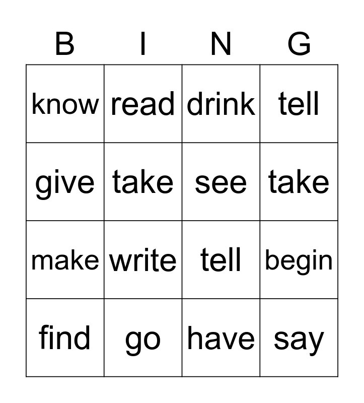 This bingo card has 20 words: begin, come, drink, eat, find, give, go, know, make, read, write, tell, take, say, see, sit, take, tell, have and stand.